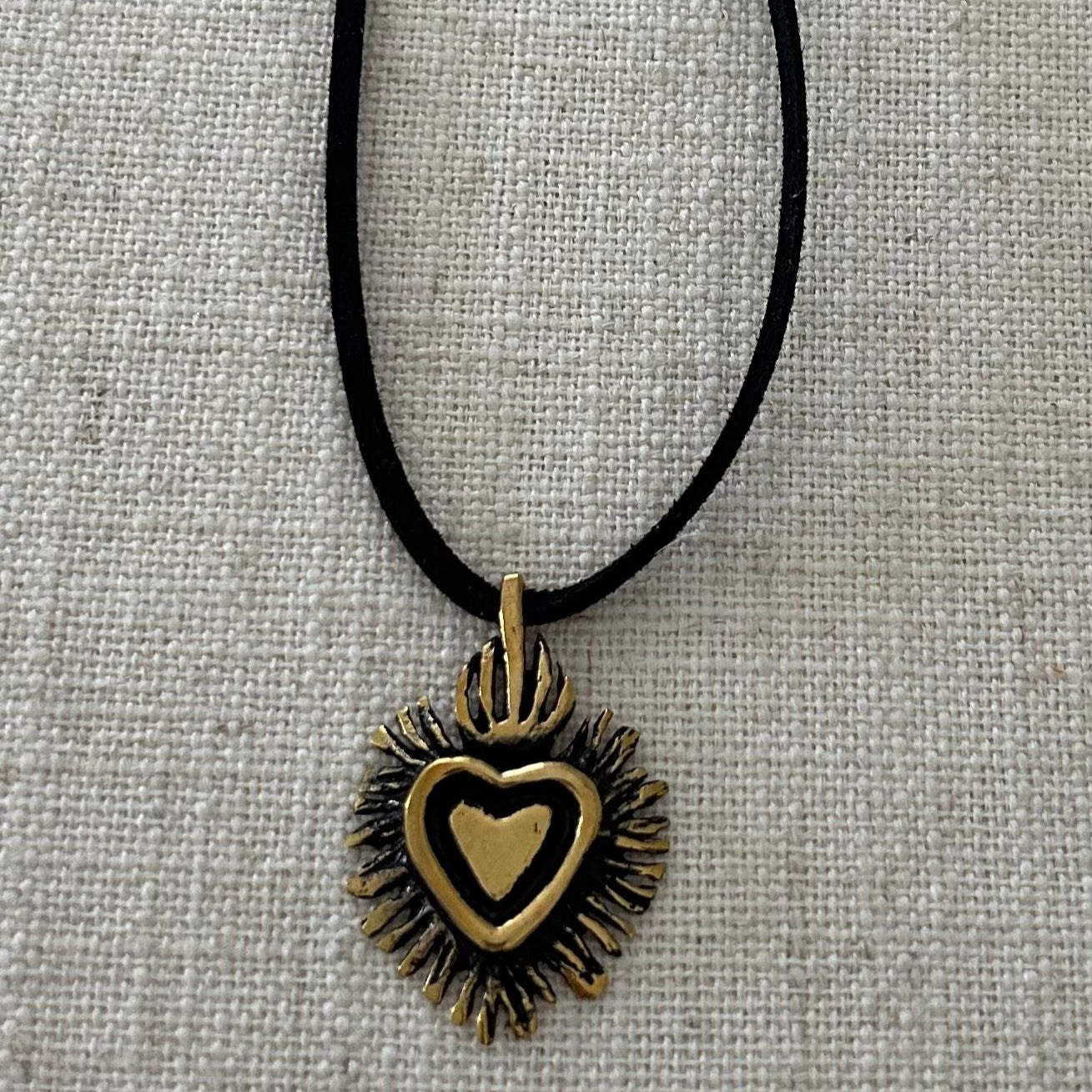 A handcrafted bronze Sacred Heart pendant, paired with a soft suede cord. It's a symbol of love, protection and faith - simple yet profound, to carry close to the heart.