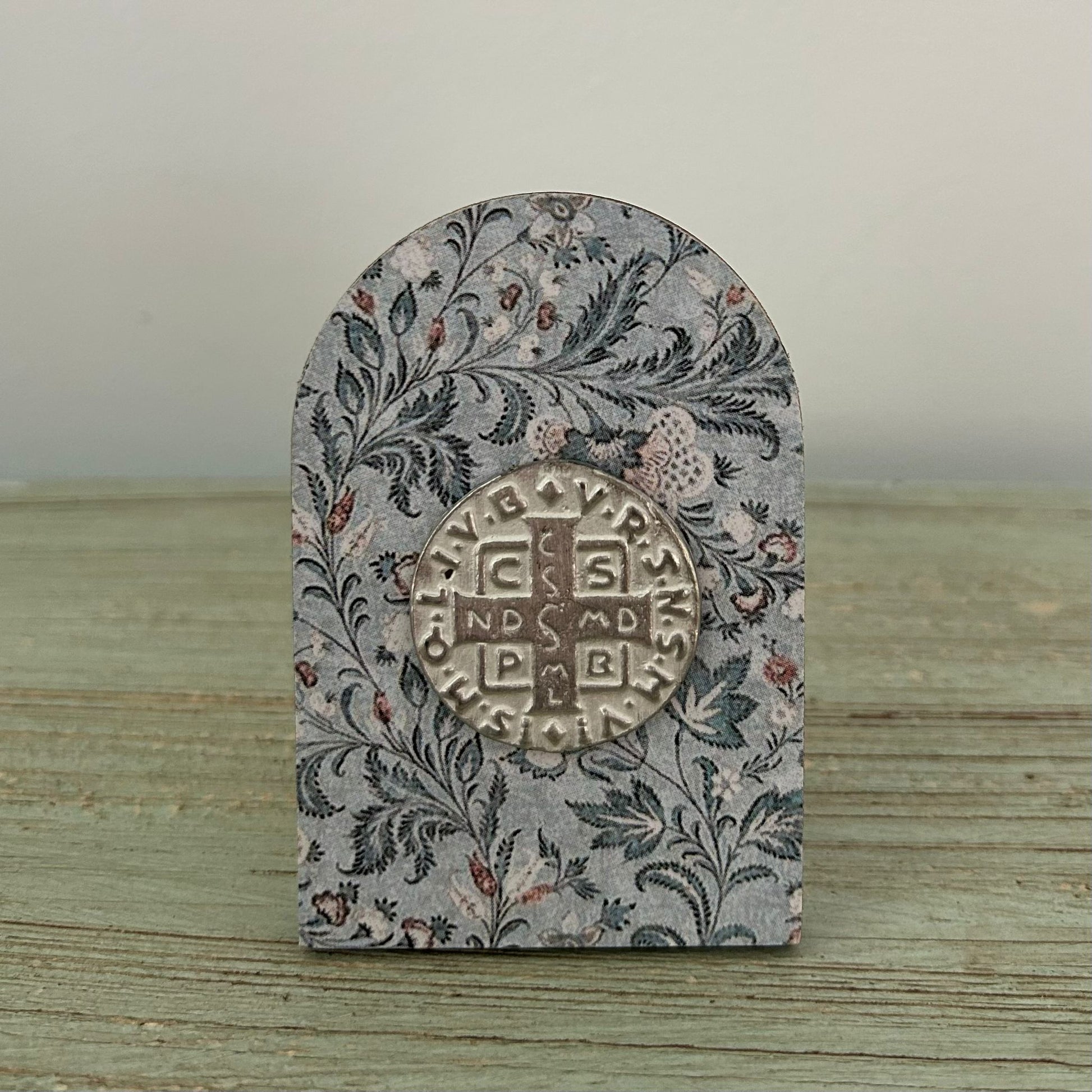 Small tabletop wooden stand with a St Benedict medal, available in 2 different designs.