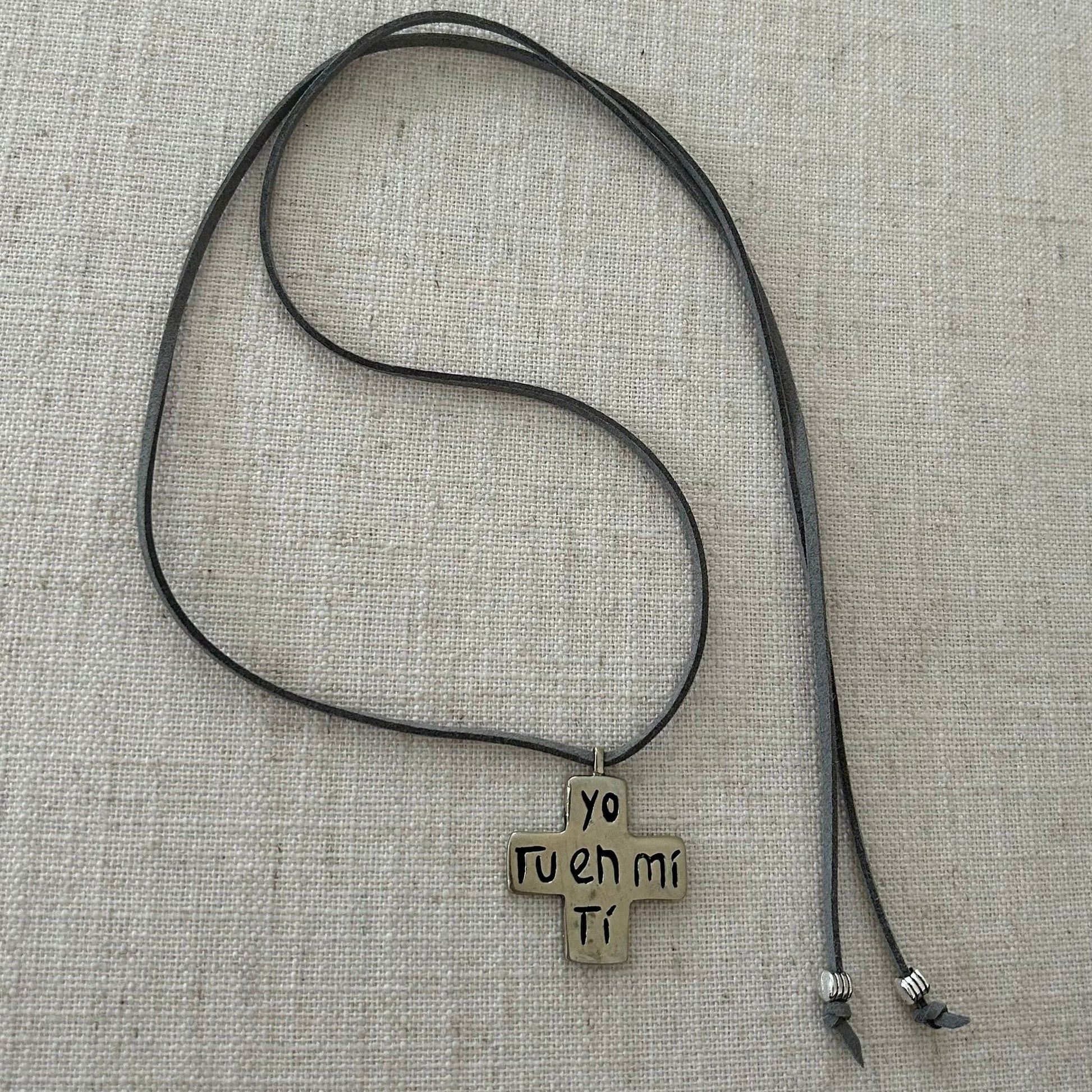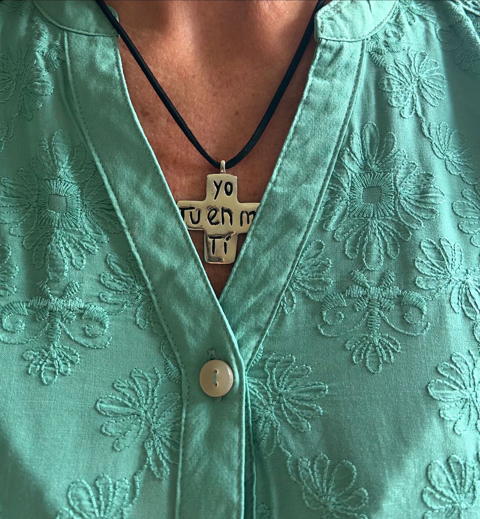 This handcrafted silver-plated alpaca cross carries the powerful inscription “Yo en Ti, Tu en Mi" (I in You, You in Me) a reminder of God’s presence dwelling within us.